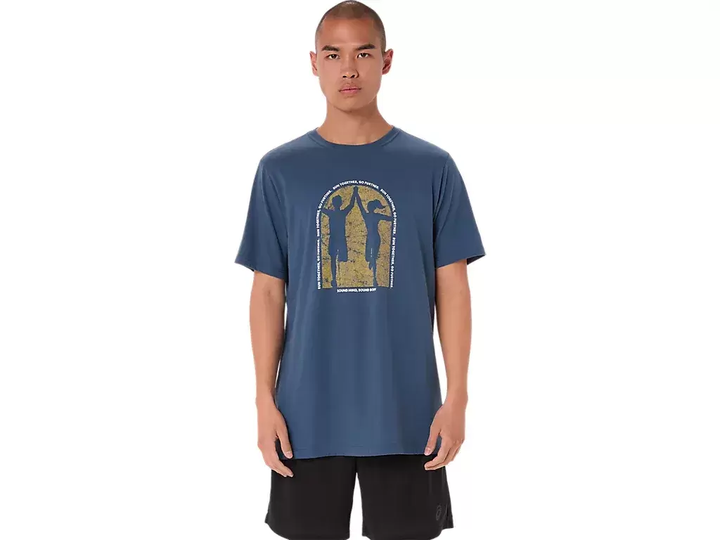 Esta camiseta de manga curta em malha confortável reconhece a importância da saúde mental global. A estampa frontal apresenta dois corredores de mãos dadas e a frase “CORRAM JUNTOS, VÃO MAIS LONGE” circulando no centro do design.
