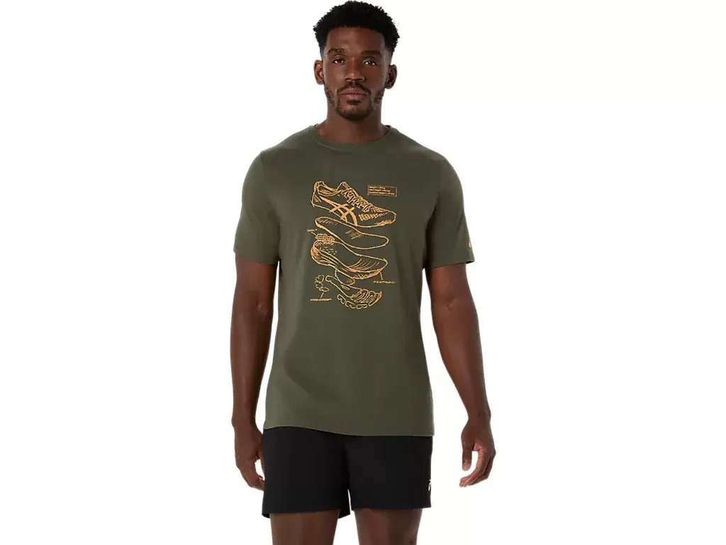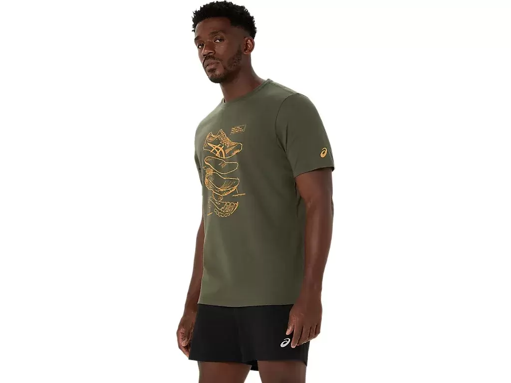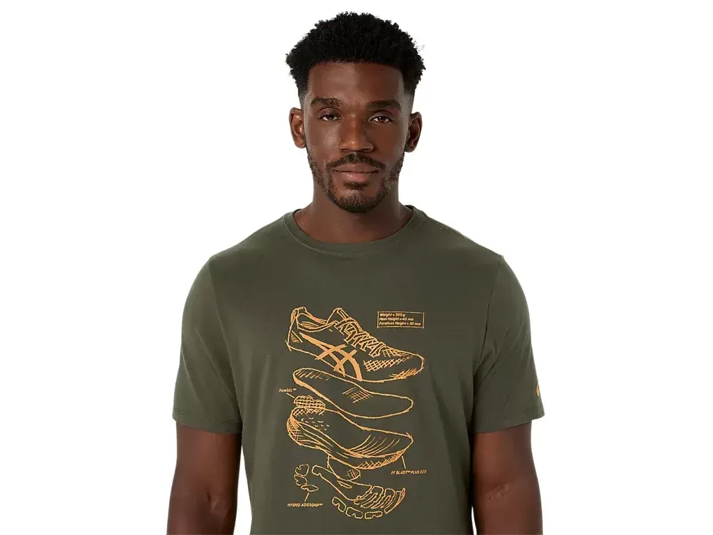 Esta camiseta de manga curta em malha confortável se inspira nos esboços dos tênis de corrida de alto desempenho da ASICS. Ela possui uma estampa frontal que apresenta os diversos componentes usados na fabricação dos nossos tênis de corrida.