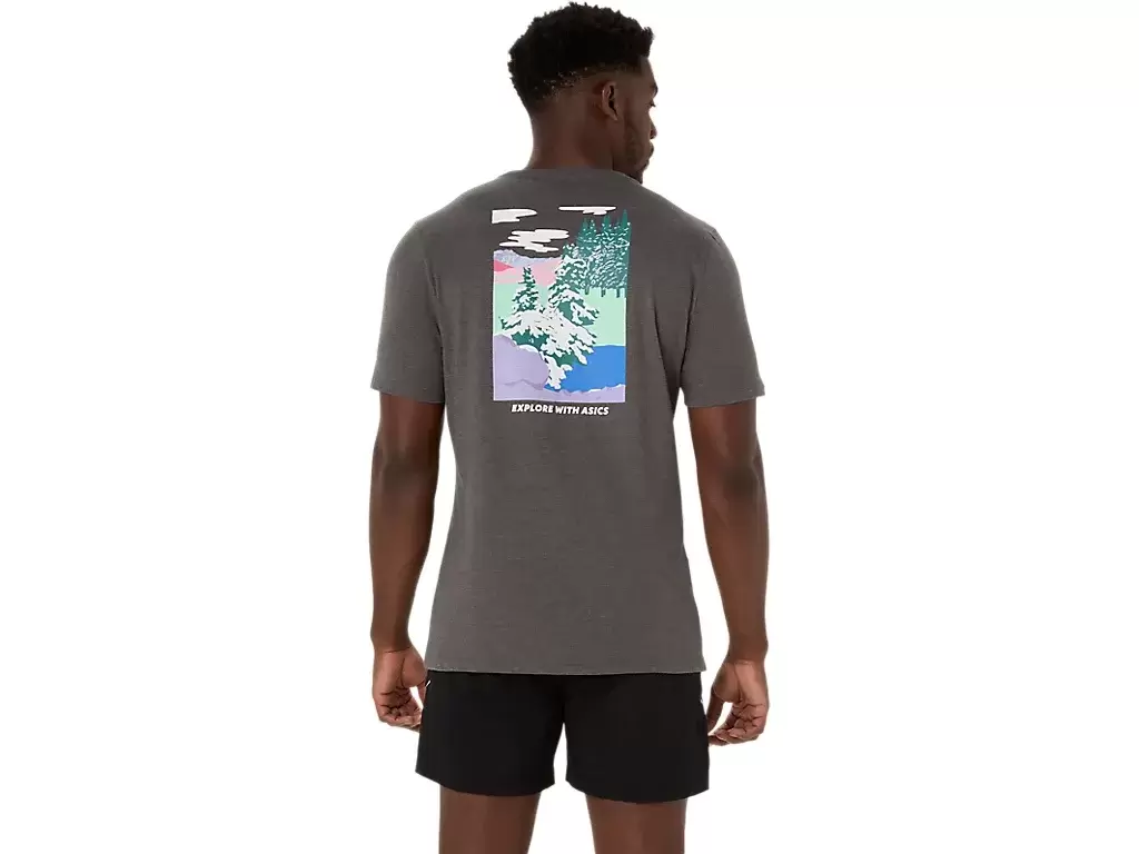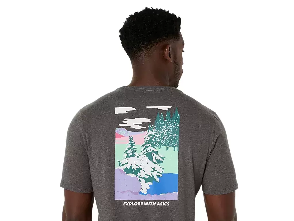 Esta camiseta de manga curta em malha confortável se inspira em cenas da natureza. Ela apresenta uma estampa serena de floresta com a frase “EXPLORE WITH ASICS” estampada no peito.