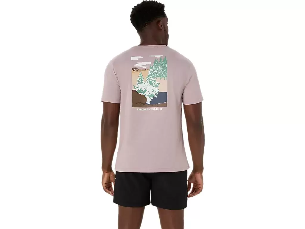 Esta camiseta de manga curta em malha confortável se inspira em cenas da natureza. Ela apresenta uma estampa serena de floresta com a frase “EXPLORE WITH ASICS” estampada no peito.