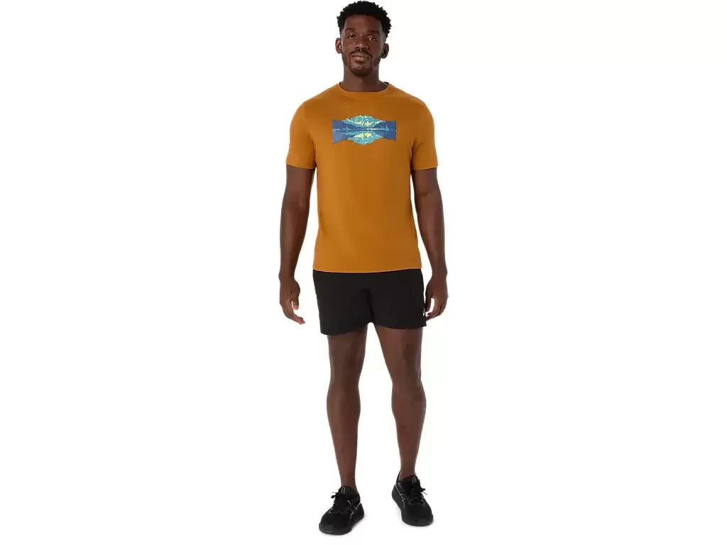 Esta camiseta de manga curta em malha confortável se inspira na natureza. A estampa frontal apresenta um lago sereno com picos de montanhas ao fundo.