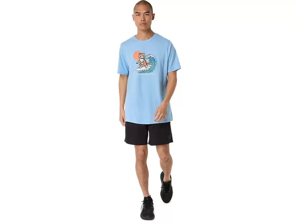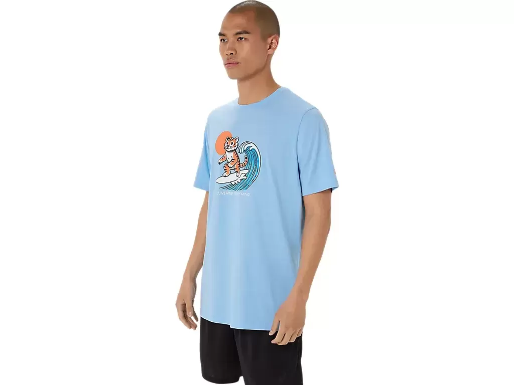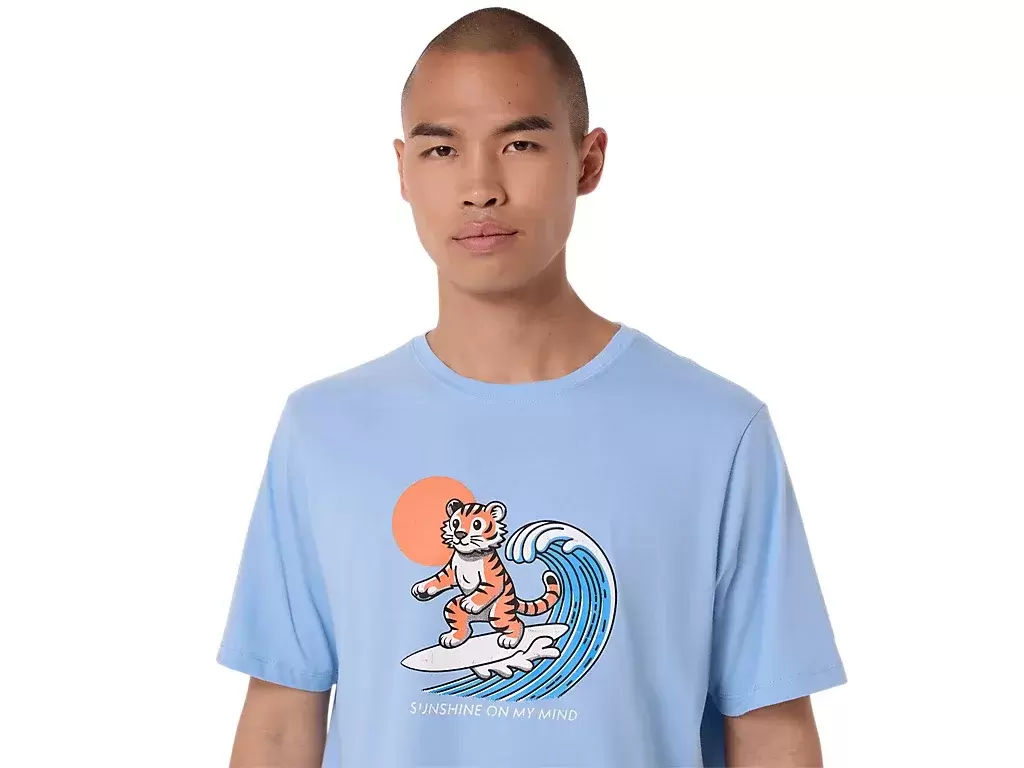 Esta camiseta de manga curta em malha confortável se inspira na praia. A estampa frontal apresenta um tigre surfando, enquanto a frase “SUNSHINE ON MY MIND” aparece abaixo.