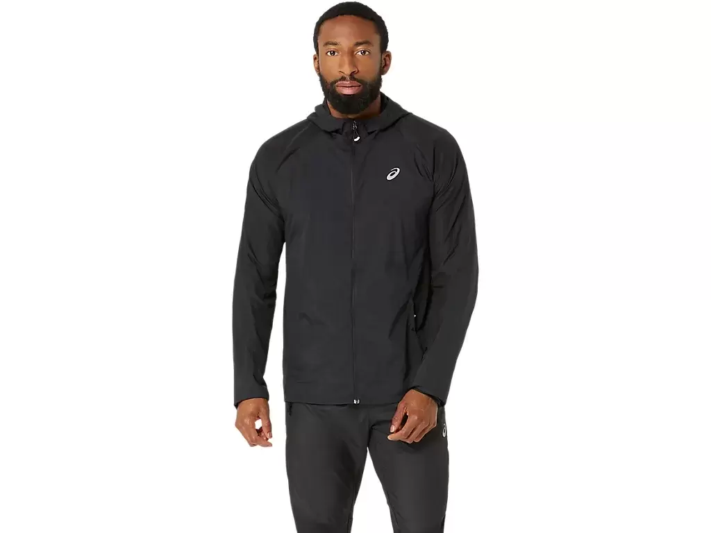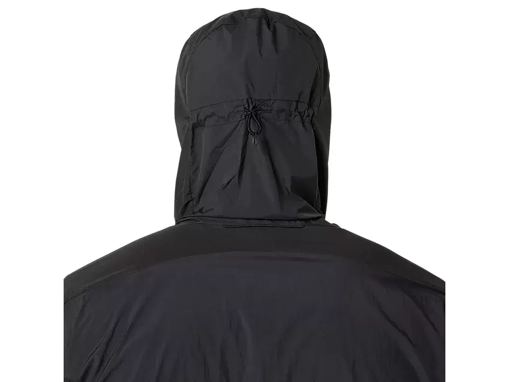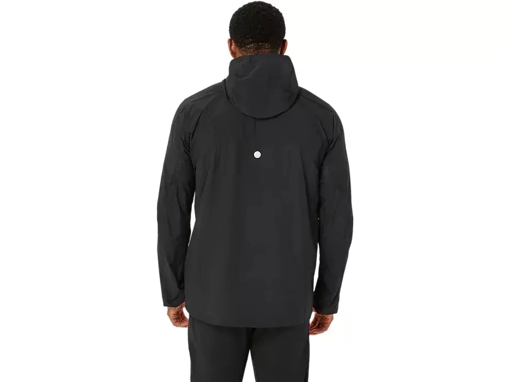 É uma jaqueta versátil, projetada para proteger contra chuva e vento, e pode ser facilmente removida e guardada no bolso lateral durante a corrida.