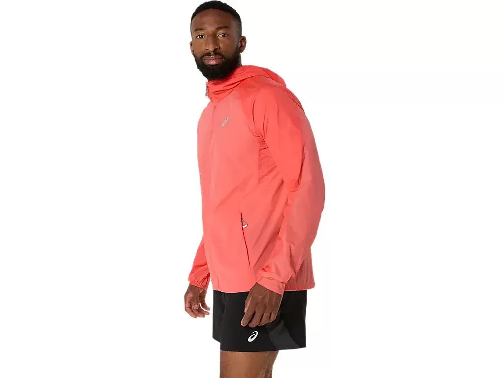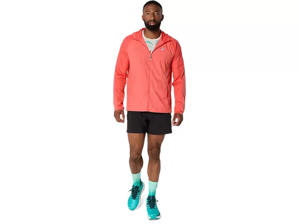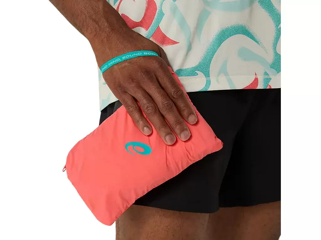 É uma jaqueta versátil, projetada para proteger contra chuva e vento, e pode ser facilmente removida e guardada no bolso lateral durante a corrida.