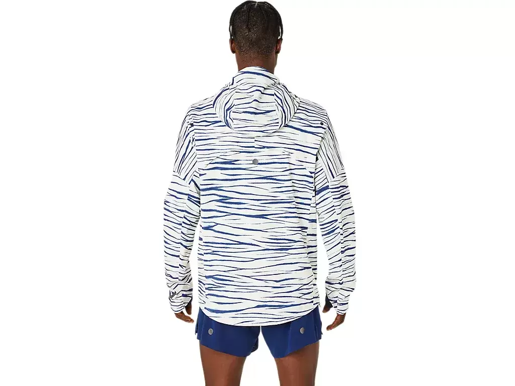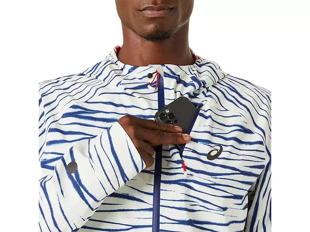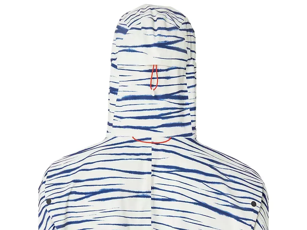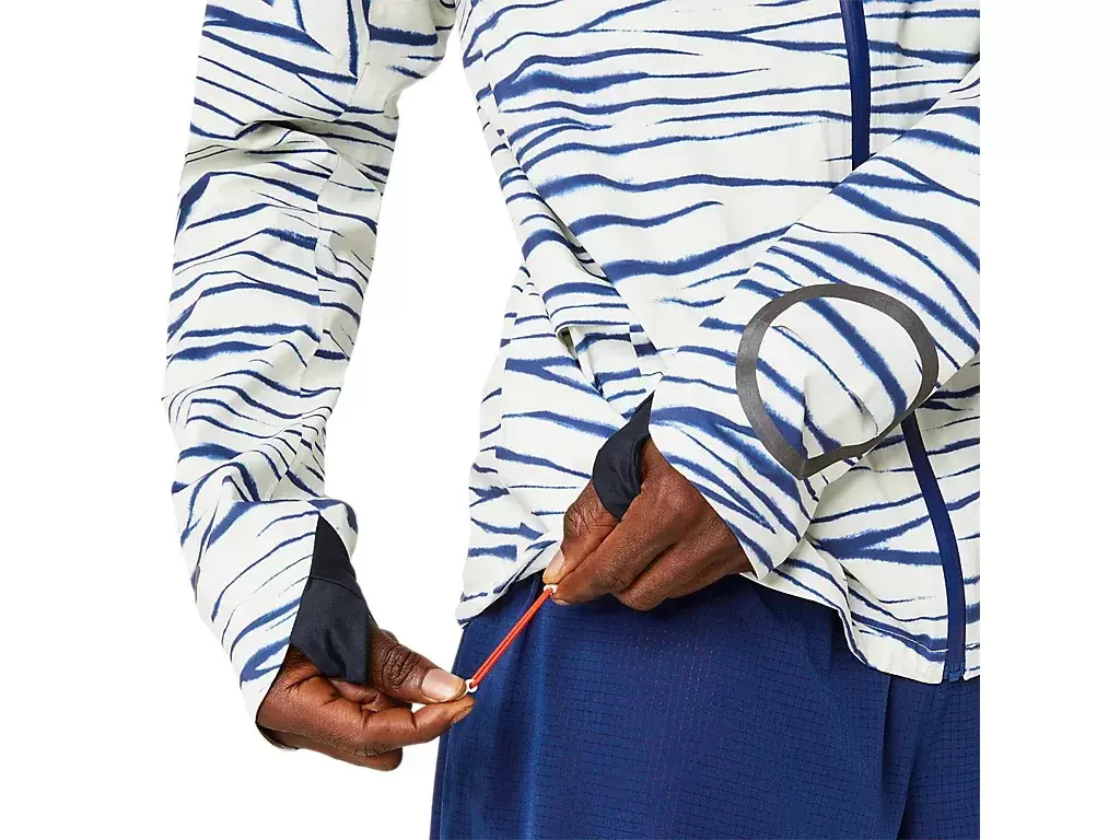 A jaqueta impermeável METARUN™ SHIBORI é uma das mais avançadas da coleção de corrida da ASICS. Ela é funcional mesmo em condições climáticas adversas e pode ser facilmente removida e guardada no bolso do peito durante a corrida. A jaqueta apresenta uma estampa inspirada no Shibori, uma técnica tradicional japonesa de tingimento. Esta jaqueta possui construção totalmente impermeável, é leve e respirável. A jaqueta possui orifícios para os polegares e um capuz ajustável com viseira integrada. Seu design ergonômico e a construção com ombros caídos melhoram a liberdade de movimento. Há também um cordão de ajuste na barra que ajuda a manter a jaqueta no lugar durante a movimentação. Pelo menos 50% do material principal da peça é feito com poliéster reciclado para reduzir o desperdício e as emissões de carbono.
