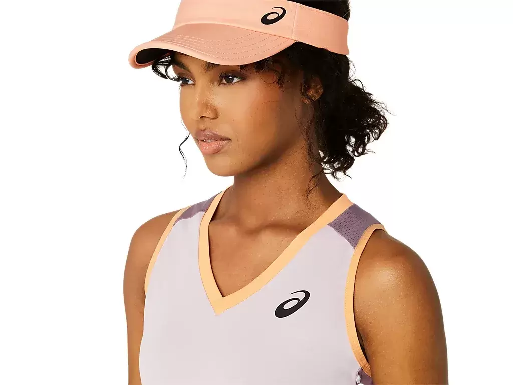 Esta viseira foi projetada com uma aba curva para ajudar a proteger seu rosto do sol. Ela também possui uma tira ajustável na parte de trás e boas propriedades de absorção de umidade para ajudar a mantê-lo seco nas quadras.