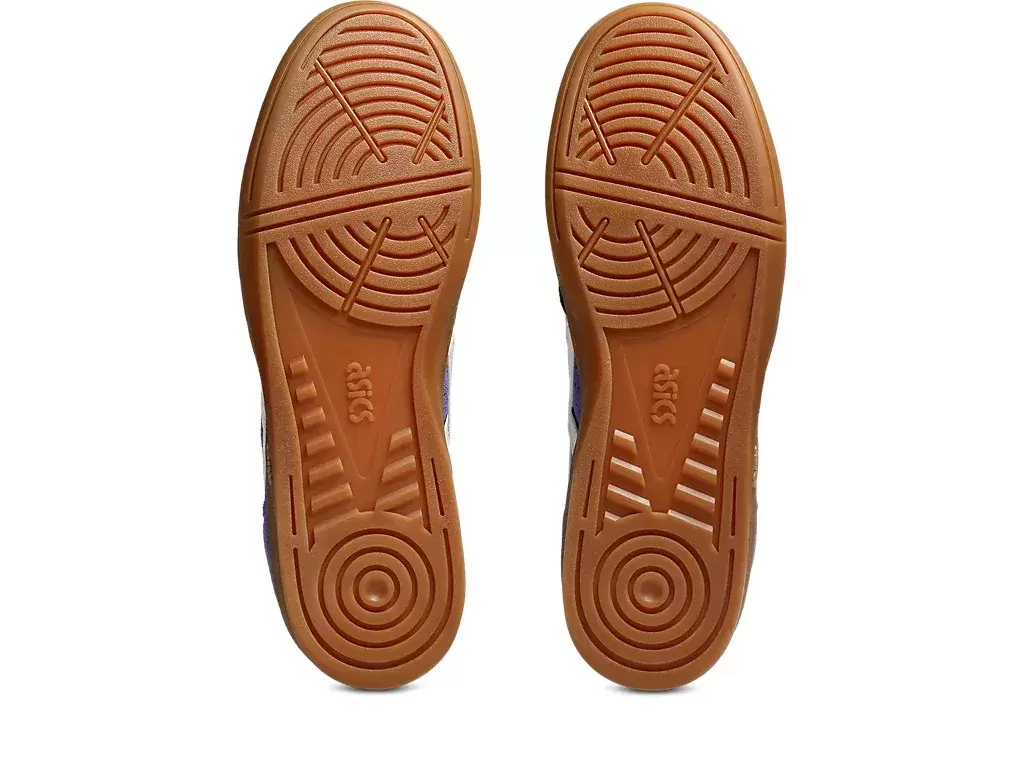 A construção atualizada do tênis apresenta painéis de camurça e solados de borracha natural.