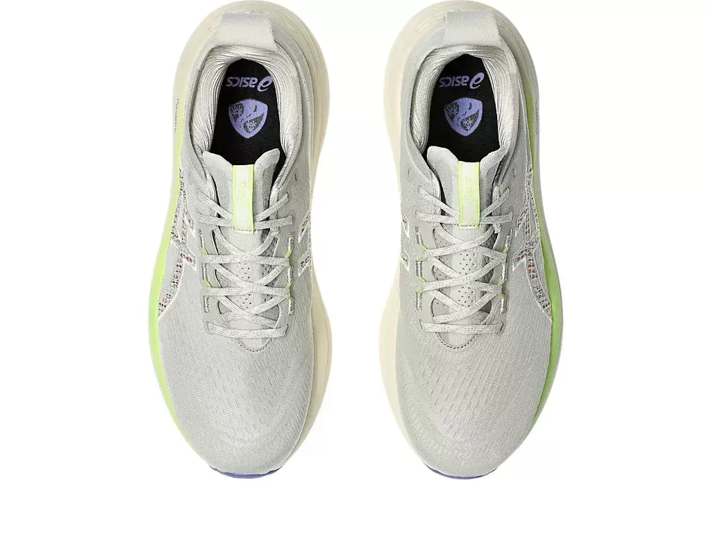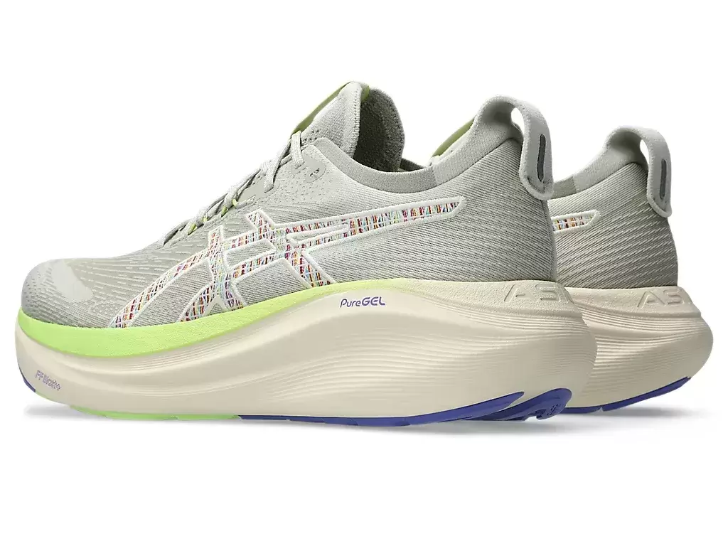 A parte externa do calcanhar atinge o solo em um ângulo maior, com pouca ou nenhuma pronação normal, causando uma grande transmissão de impacto através da parte inferior do pé. O tênis GEL-NIMBUS® 27 NATURE BATHING™ TR oferece amortecimento macio que proporciona a sensação de estar pisando em nuvens. Seu design foi reformulado para criar uma experiência de corrida mais suave e confortável. As cores são inspiradas em elementos da paisagem litorânea tropical, como ondas, madeira à deriva, pedras e conchas. O cabedal em malha jacquard macia envolve o pé confortavelmente, proporcionando ventilação avançada. Além disso, a lingueta e a gola em malha ajudam a proporcionar uma sensação macia e de suporte.
