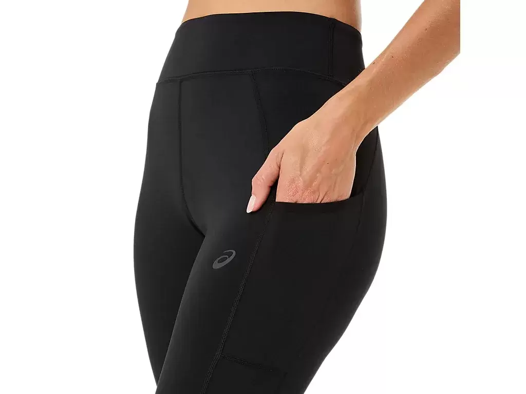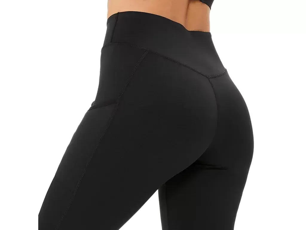 A calça possui um cós em V e um elástico fino, plano e de cintura alta que proporciona estabilidade e respirabilidade, além de bolsos laterais para guardar pequenos objetos essenciais.