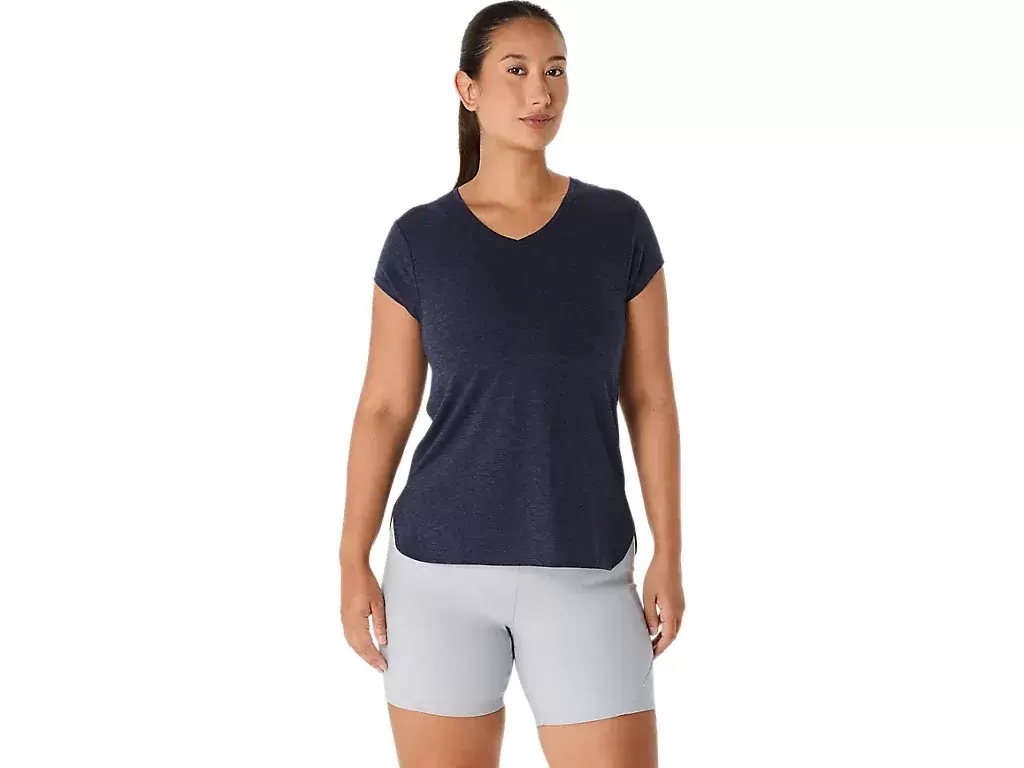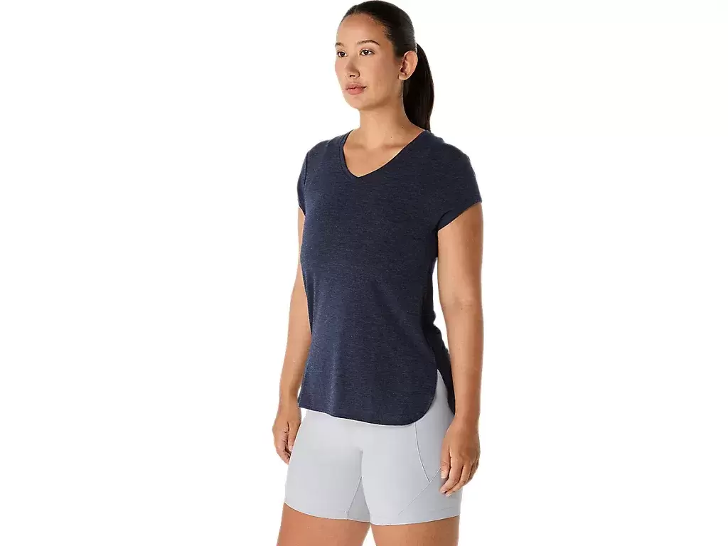 Esta blusa de manga curta com decote em V foi projetada para proporcionar uma sensação suave e agradável ao toque. Ela apresenta um tecido de malha confortável combinado com costuras laterais frontais para melhorar a liberdade de movimento.