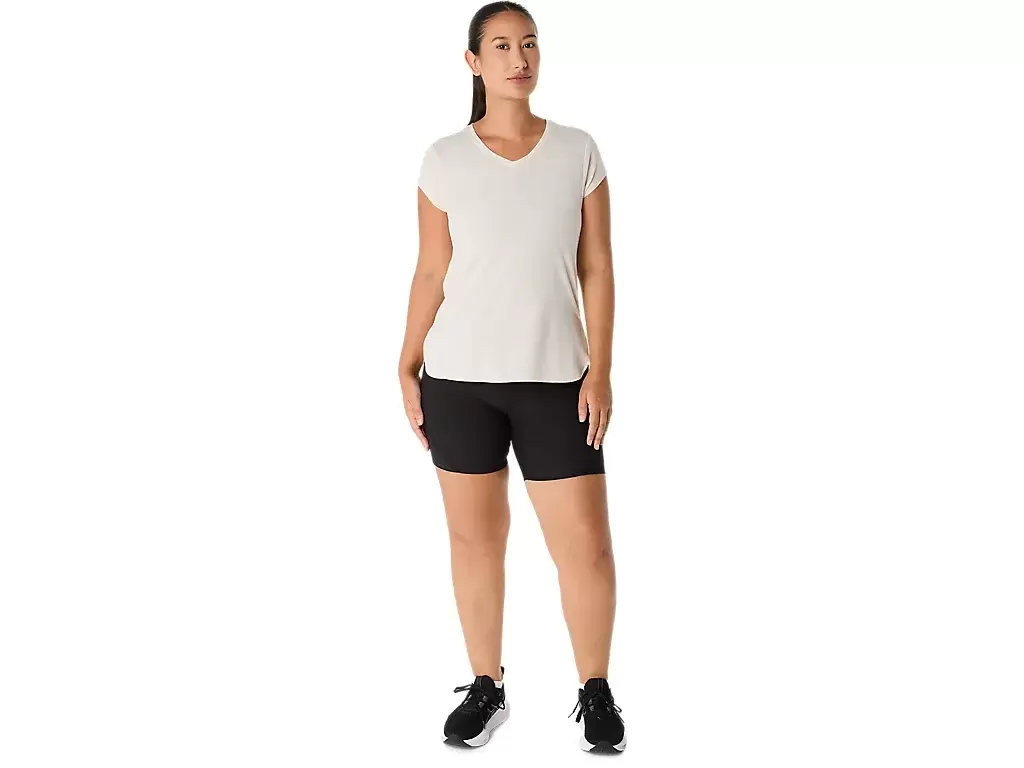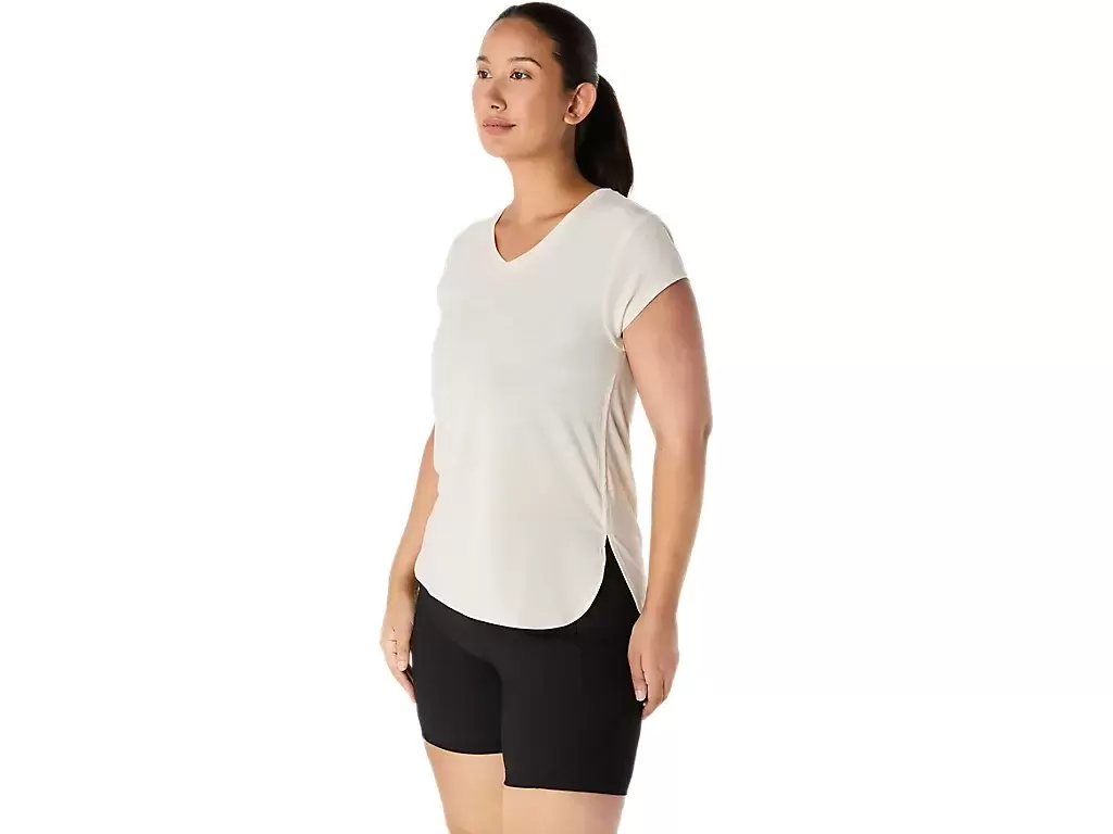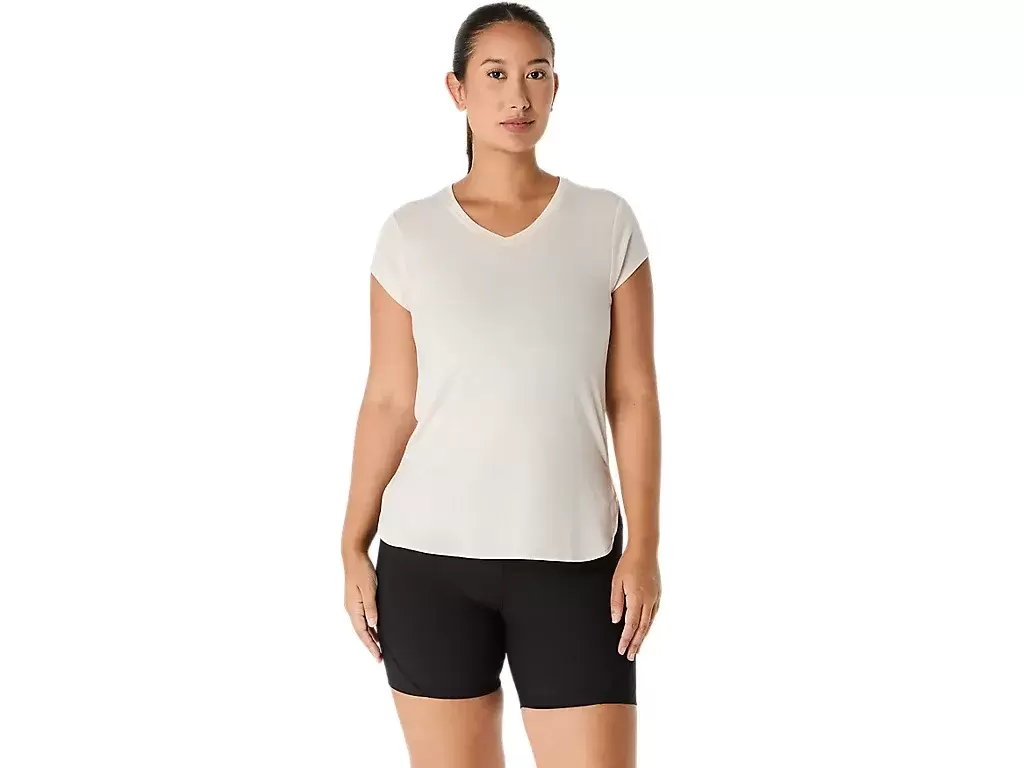 Esta blusa de manga curta com decote em V foi projetada para proporcionar uma sensação suave e agradável ao toque. Ela apresenta um tecido de malha confortável combinado com costuras laterais frontais para melhorar a liberdade de movimento.