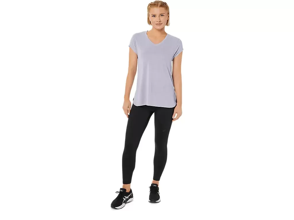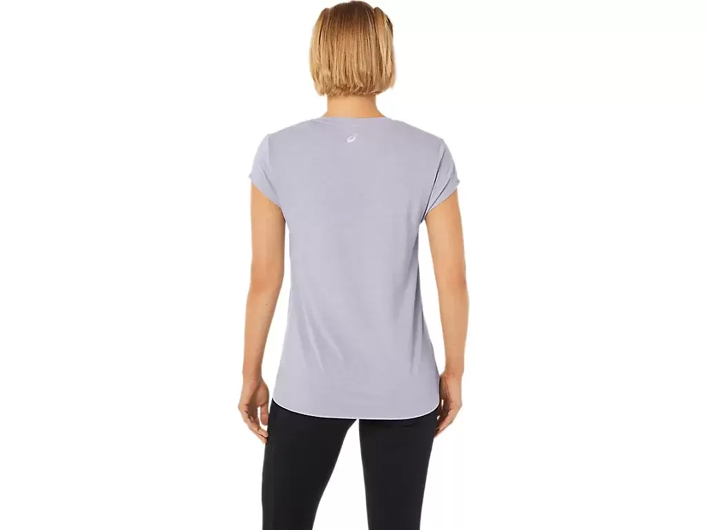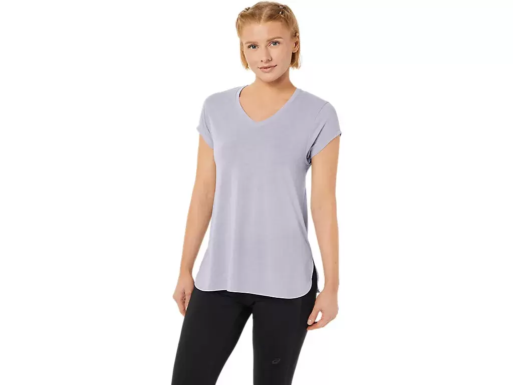 Esta blusa de manga curta com decote em V foi projetada para proporcionar uma sensação suave e agradável ao toque. Ela apresenta um tecido de malha confortável combinado com costuras laterais frontais para melhorar a liberdade de movimento.