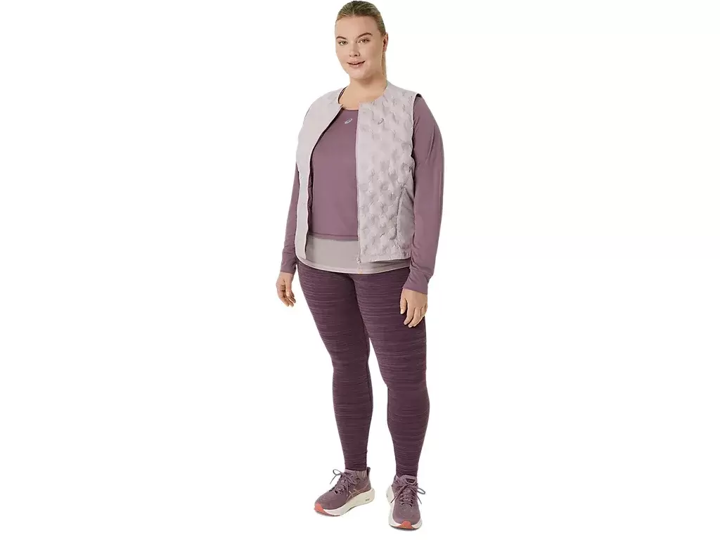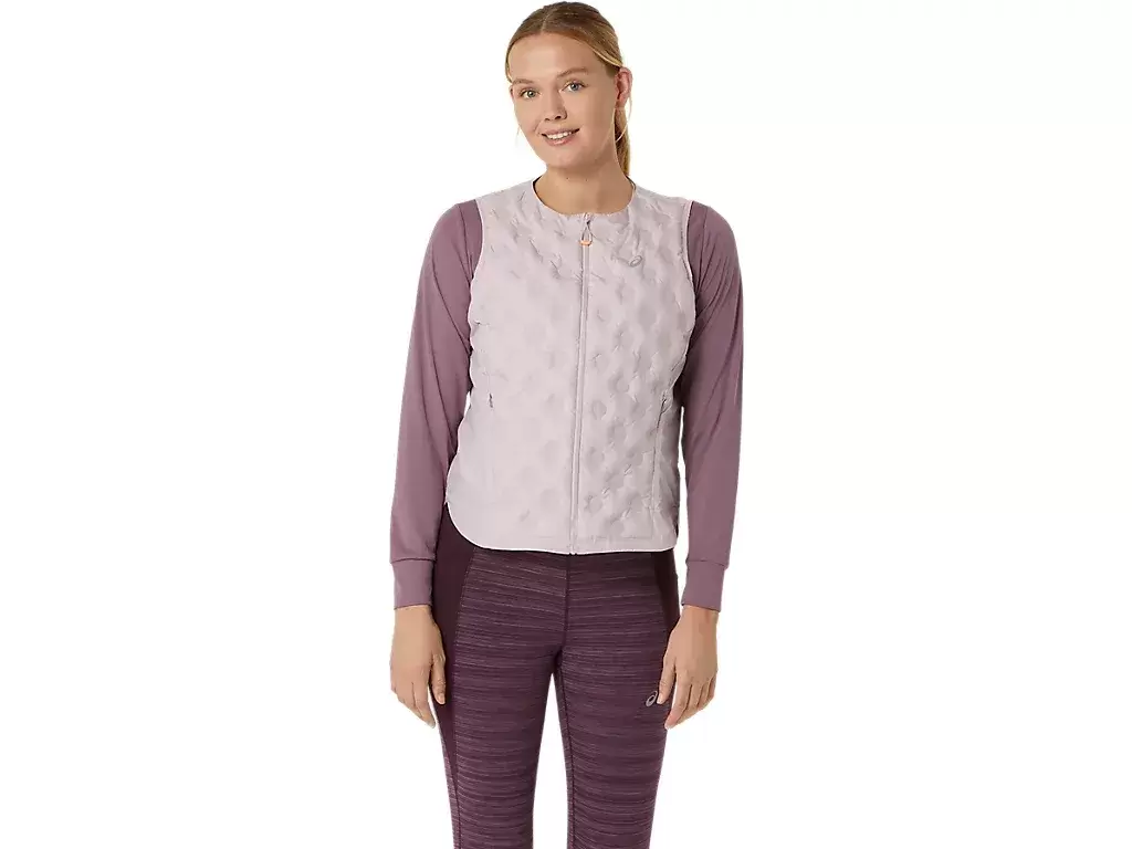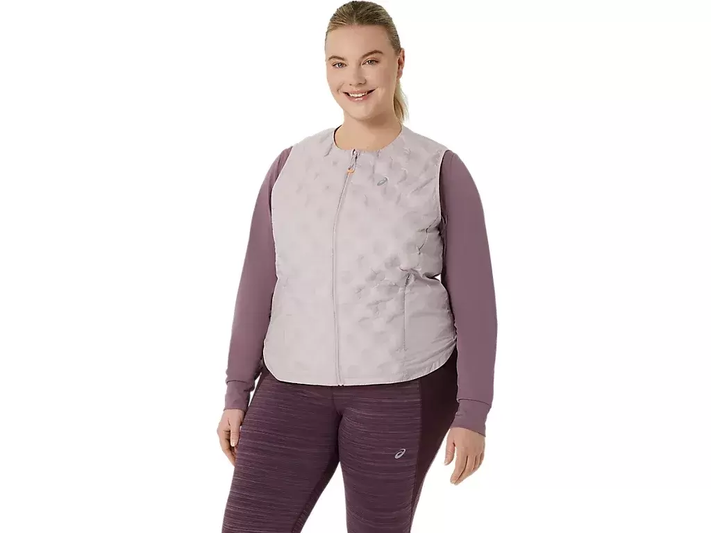 O colete possui bolsos laterais com zíper para opções de armazenamento adicionais durante a corrida. Pelo menos 50% do material principal da peça é feito com poliéster reciclado para reduzir o desperdício e as emissões de carbono.