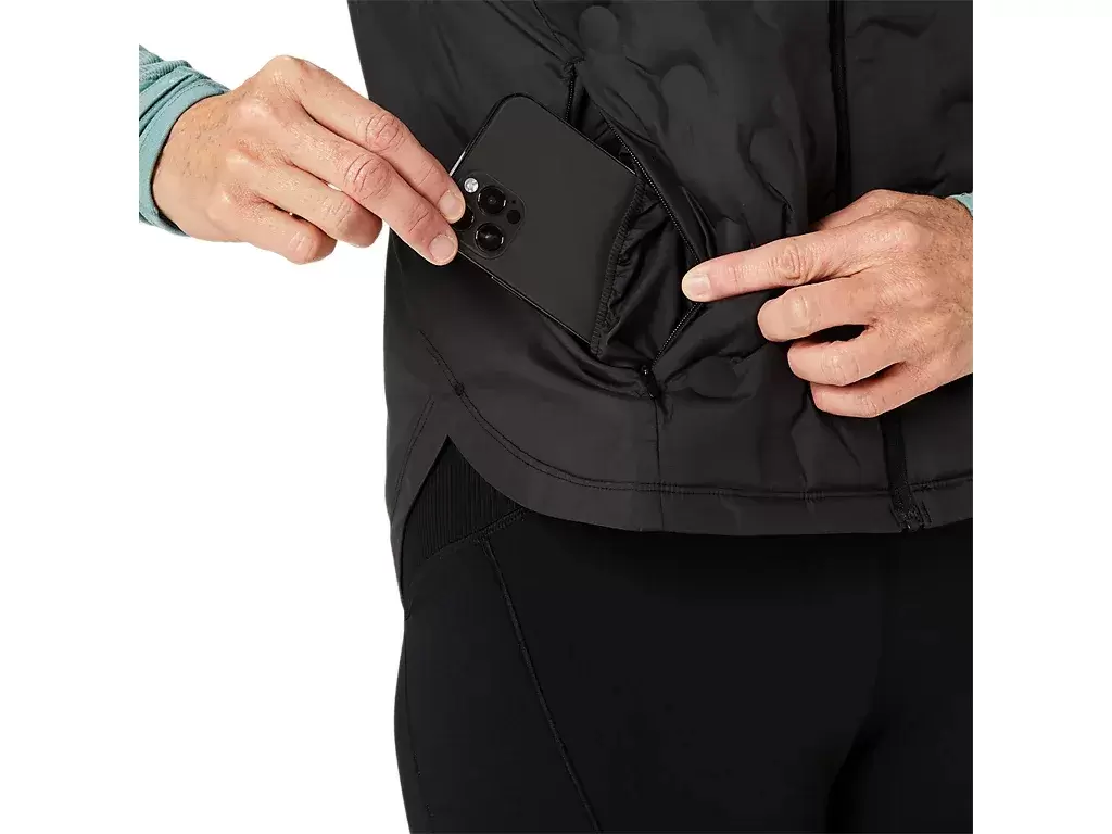 O colete possui bolsos laterais com zíper para opções de armazenamento adicionais durante a corrida.