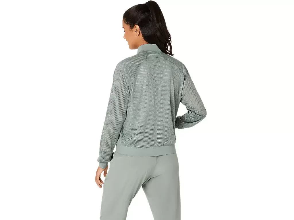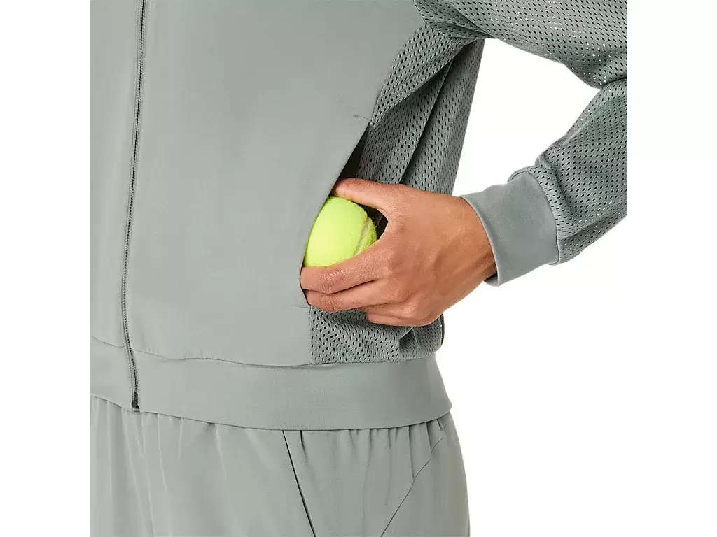 Esta jaqueta também possui bolsos laterais que permitem armazenar pelo menos duas bolas de tênis e remover o pó da quadra de saibro.