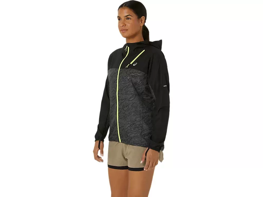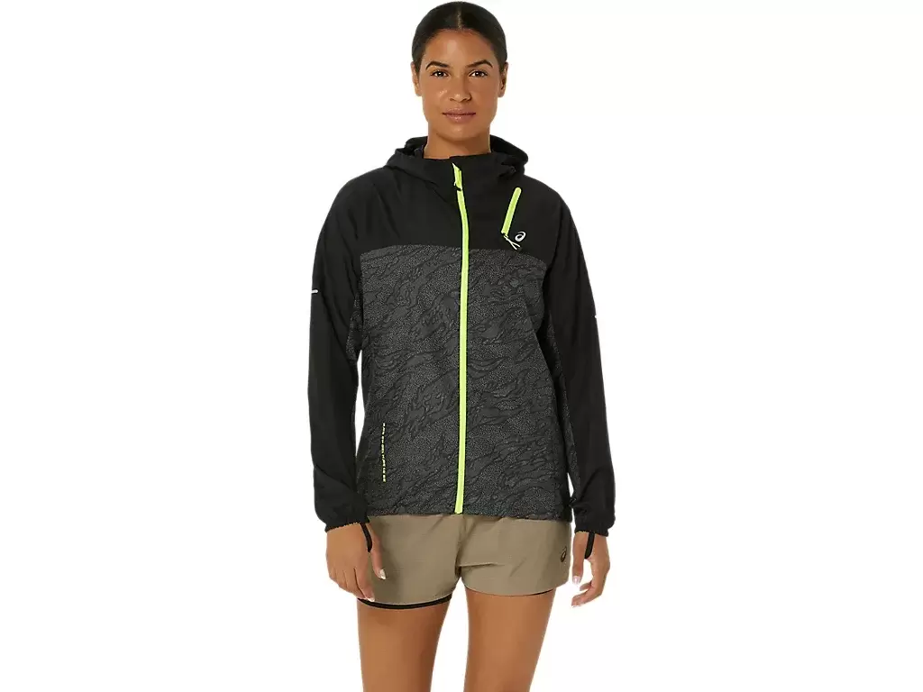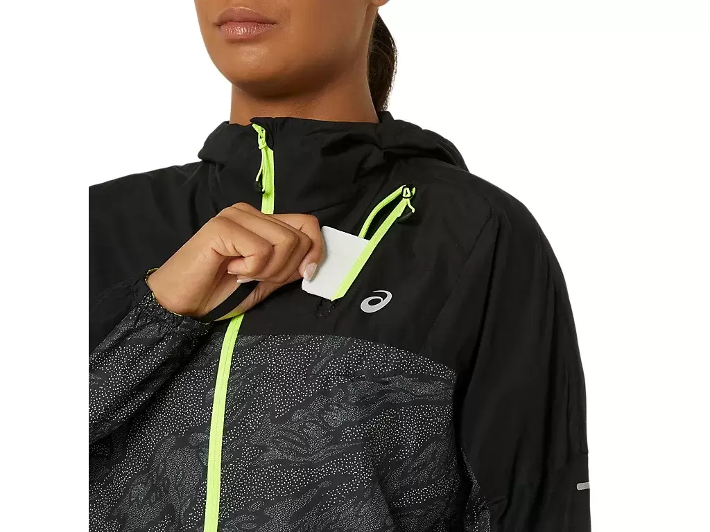 A jaqueta apresenta uma estampa por toda a peça e pode ser facilmente removida e guardada no bolso do peito durante a corrida.