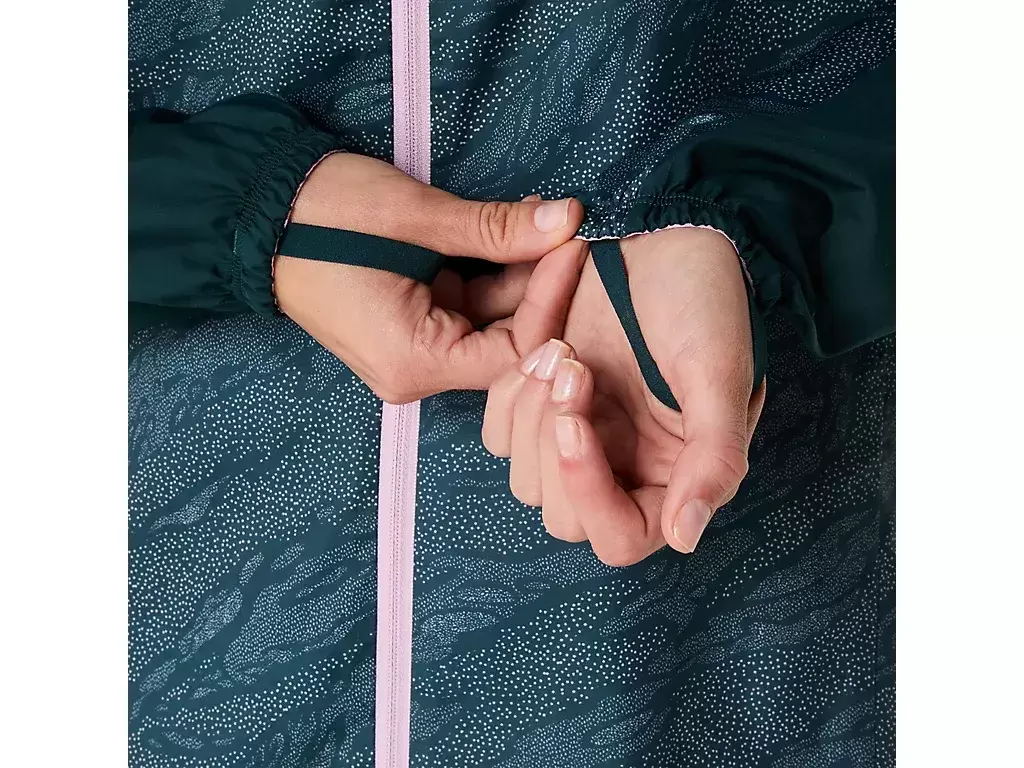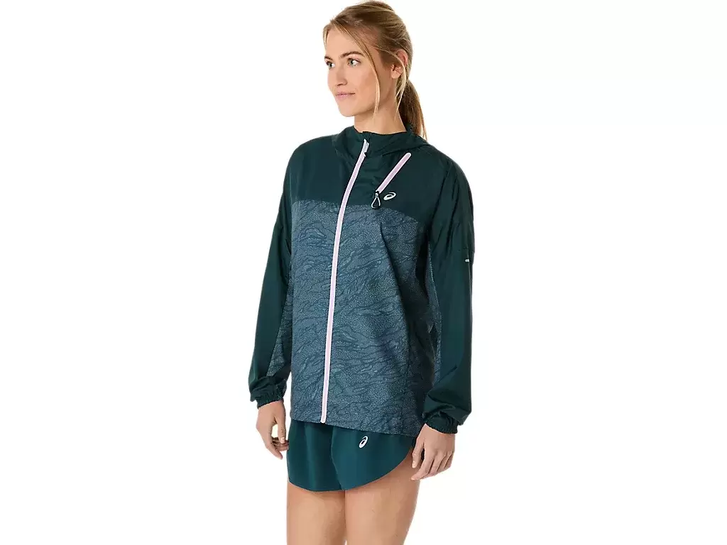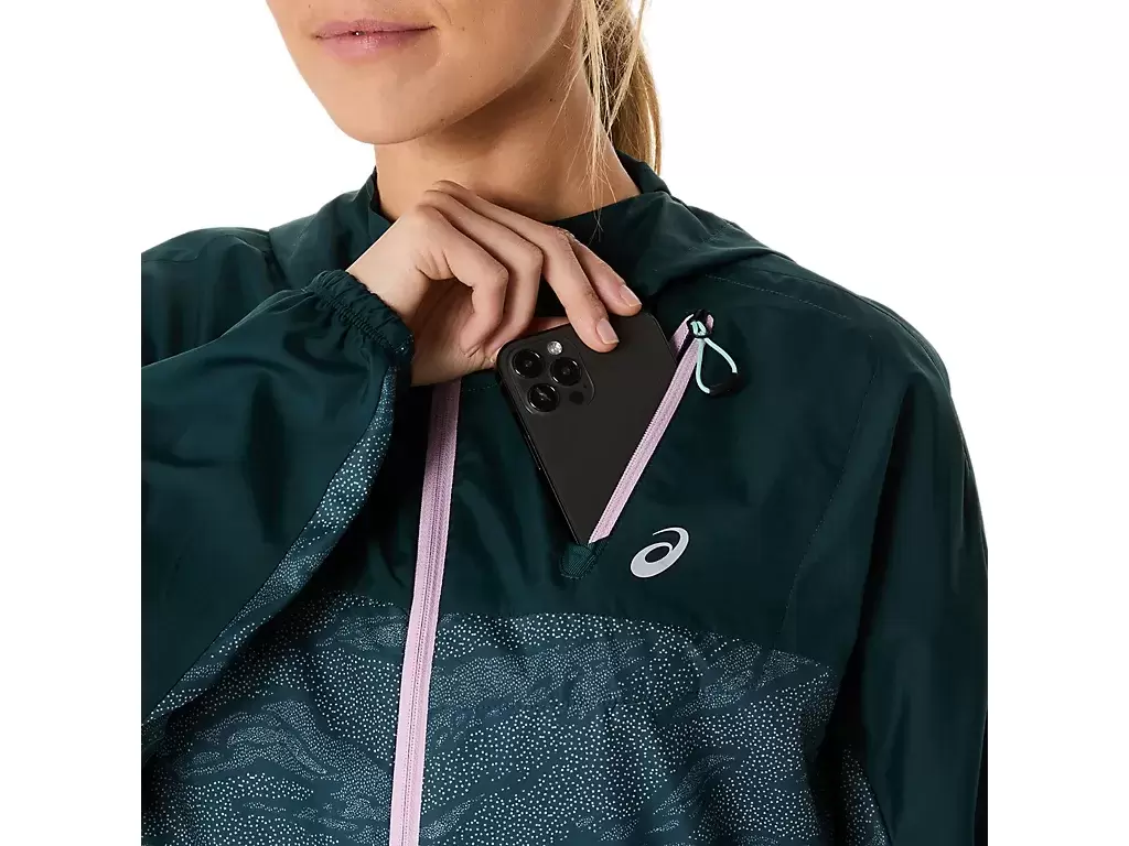 A jaqueta apresenta uma estampa por toda a peça e pode ser facilmente removida e guardada no bolso do peito durante a corrida.