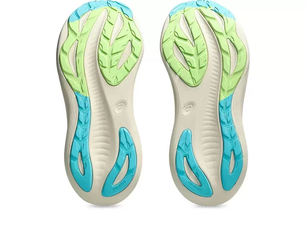 O tênis GEL-NIMBUS® 27 NATURE BATHING™ TR oferece amortecimento macio que proporciona a sensação de estar pisando em nuvens. Seu design foi reformulado para criar uma experiência de corrida mais suave e confortável. As cores são inspiradas em elementos da paisagem litorânea tropical, como ondas, madeira à deriva, pedras e conchas.